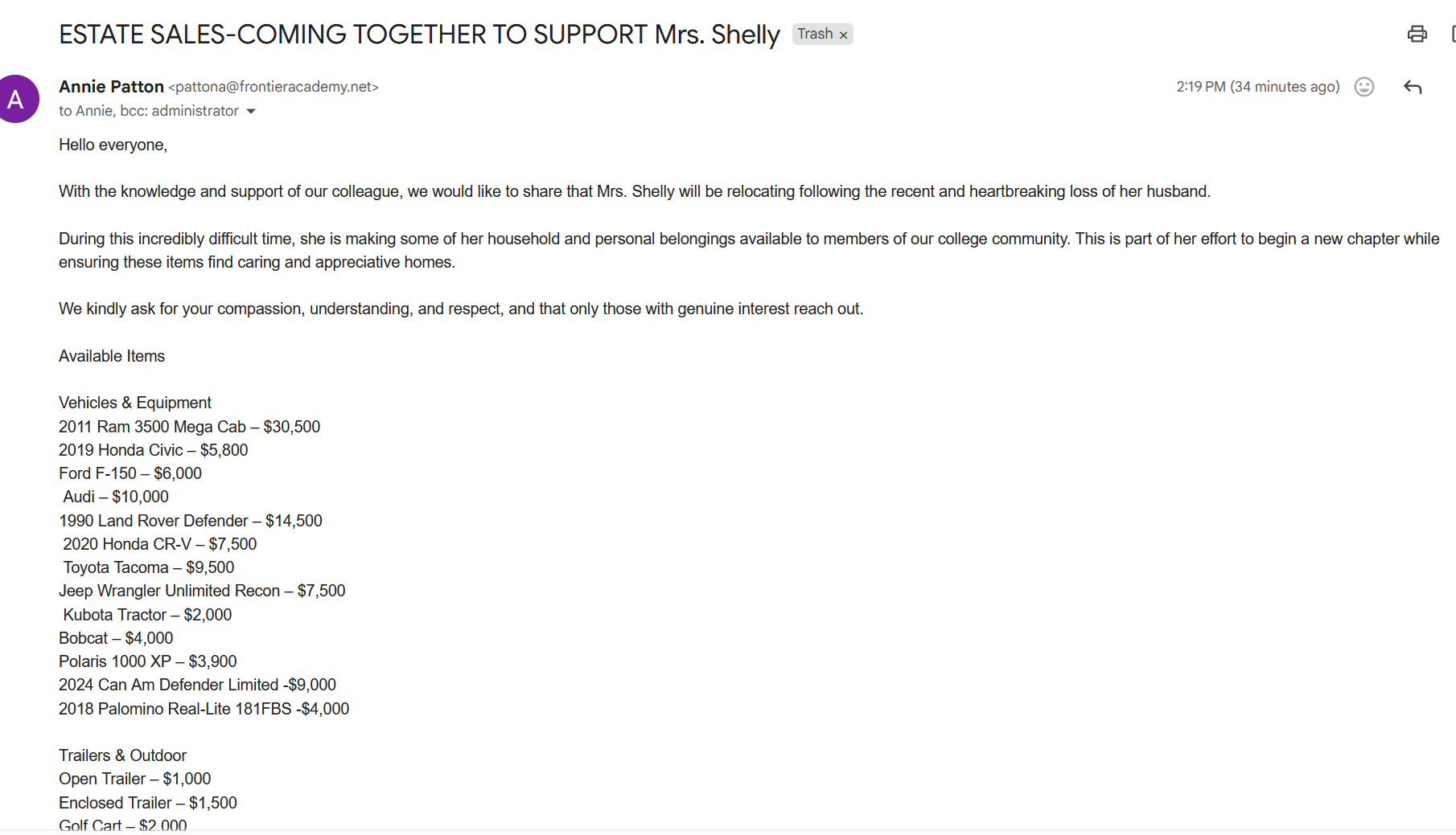 Mrs. Patton’s account—and potentially other Frontier Academy staff accounts—have been compromised due to a recent phishing attack. Please do not open or click on any emails from Mrs. Patton at this time, and use caution with any unexpected or suspicious emails containing links, even if they appear to come from staff.